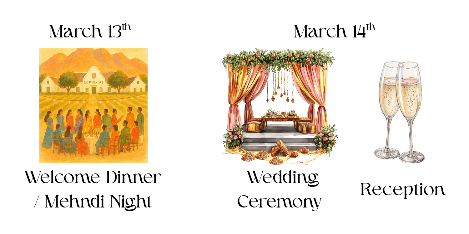 We’re so excited to celebrate our wedding weekend in Cape Town, South Africa, at the beautiful Boschendal Wine Estate. Set among vineyards and mountains, the weekend will be filled with culture, color, and time together. Below are crucial dates and times for you to know!