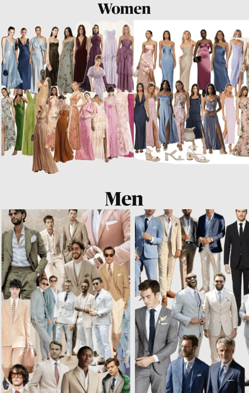 Wear a suit and tie or a tux if you wish! Light and colorful tones are welcome, if black is your staple, that works too! Add in florals if you’d like!